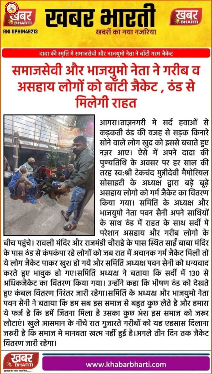 कड़ाके की ठंड को देखते हुए गरीब, असहाय एवं जरूरतमंद लोगों को कंबल वितरित किए गए। इस सेवा कार्य का उद्देश्य ठंड से बचाव करना और जरूरतमंदों को राहत प्रदान करना था। कार्यक्रम के दौरान बुजुर्गों, महिलाओं, बच्चों और सड़क किनारे रहने वाले लोगों को प्राथमिकता के आधार पर कंबल दिए गए।